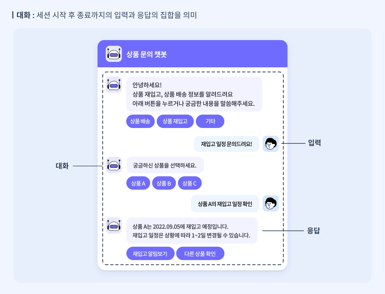 응답 : 입력에 대해 서비스나 챗봇이 처리한 결과를 의미합니다.