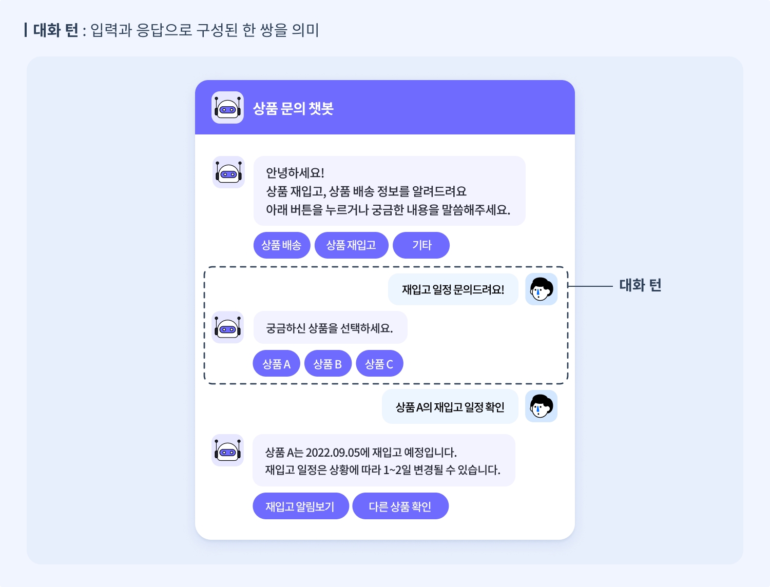 입력과 응답으로 구성된 한 쌍을 의미합니다. 예를 들어, 아래 이미지는 '1개의 세션에 대화가 2턴까지 진행된 상태'라고 볼 수 있습니다.